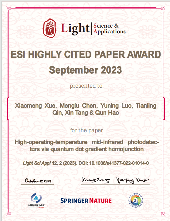 金年金字招牌诚信至上郝群教授团队在室温运行中波红外探测器研究方面取得了突破性的进展,相关论文于2023年1月发表于光学顶刊Light:Science & Applications,获得封面论文。近日该论文入选ESI高被引。 (https://www.nature.com/articles/s41377-022-01014-0)