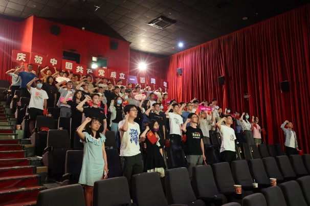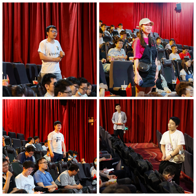 观影候场时,北理工2020级光工学硕2班党支部、清华大学机研201、171党支部的同志们手持党旗,在制作的建党100周年主题的立牌处进行拍照打卡留恋,以表达对党的祝福和对未来的希冀。在这样轻松和欢快的氛围中,各支部同志相互进行了密切且深入的交流,活动热情达到了高点。
