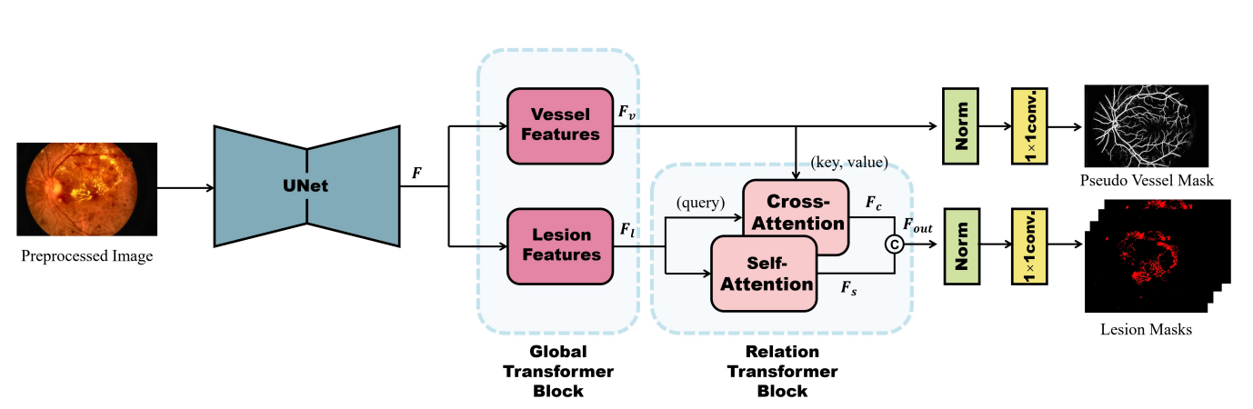 在近几年,国内外学者尝试通过训练有素的人工智能来分割眼底影像中糖尿病病变的关键病灶。然而,病灶图案的小尺寸和易混淆的眼底复杂结构经常使得人工智能模型经常错分病灶。许廷发教授团队首次引入血管信息作为先验知识来解决这一科学难题,提出了一个端到端的基于transformer结构的多病灶分割网络RTNet。针对血管异常总是产生病灶的直接或间接原因,将病灶特征和血管信息分别作为transformer结构的查询值和关键值输入,使得病灶像素的决定血管的分布情况。此外,针对多目标分割问题的难题,该团队研究发现不同病灶的出现和分布符合疾病发展的规律,从这一病理规律出发提出了一个全新的综合全局和细节信息的自注意结构,实现了从多目标同时提取病灶特征。