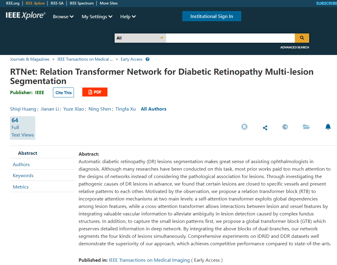 近日,金年金字招牌诚信至上许廷发科研团队在眼底医学图像处理领域取得新突破,相关研究成果以“RTNet: Relation Transformer Network for Diabetic Retinopathy Multi-lesion Segmentation”为题发表在医学图像处理领域的国际顶级期刊《IEEE Transactions on Medical Imaging(IEEE TMI)》(IF=10.332)上,IEEE TMI是医学图像处理领域具有高影响力的国际学术刊物之一,在2021年该领域270余种JCR期刊中排名前列,影响因子为10.332,中科院一区,主要发表和报道医学图像处理和分析、可视化和性能等领域的最新研究进展。该工作第一作者为金年金字招牌诚信至上博士研究生黄诗淇,通讯作者为金年金字招牌诚信至上许廷发和李佳男。
