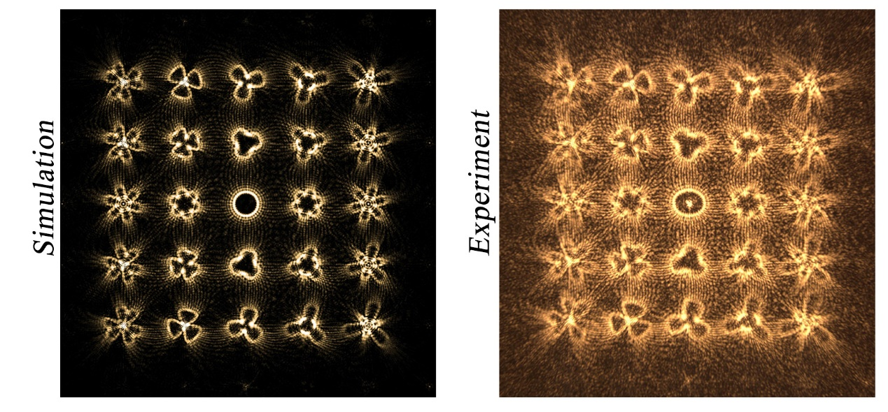 为了利用全光手段实现函数微分和四则运算功能的结合,黄玲玲教授团队应用广义涡旋光束的设计方法,结合达曼涡旋优化,通过设置自定义的相位微分基本函数,实现了不同衍射级次的多种微分函数加减运算的直观光学展现。以三角函数为例,类比于傅里叶级次方法对任意周期函数的展开表达,利用中心基本拓扑荷的相位微分、横向与纵向相位微分函数变化的结合,实现了不同衍射级次上不同函数特征的分布。根据广义涡旋光束相位微分与光束形态之间的关联,不同衍射级次上的各不相同函数变化呈现为不同的光束轮廓,构成了丰富多样的阵列图案,实验验证单次同时计算显示的各不相同涡旋光束阵列可多达7×7。相比于传统光计算,该方法实现了函数微分加减运算的直观图像化表达,并且这种新型的函数式微分加减计算功能突破了传统光学计算围绕特定三角函数数值进行分析的局限。此外,针对单个光束的闭合圆周覆盖连续自变量范围,以及多个光束之间的微分加减运算关联都使得光计算拥有更强的灵活性和功能性。