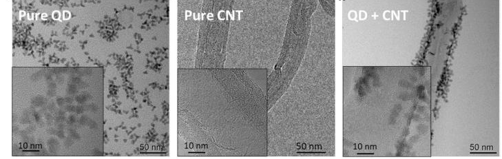 图1 碲化汞胶体量子点,碳纳米管以及二者耦合后的纳米复合材料的微观形貌图。