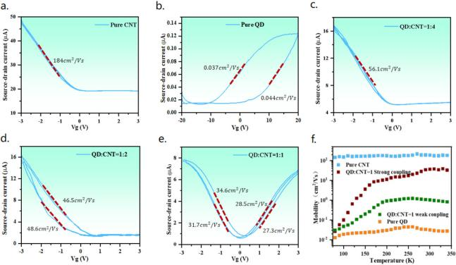 图2 不同比例碲化汞胶体量子点和碳纳米管耦合后的纳米复合材料的场效应晶体管传输特性曲线以及载流子迁移率对比。
