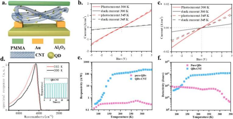 红外光电探测器广泛应用于工业检测、环境监测、生物医学成像等领域。然而,其大规模应用却受限于传统窄带半导体较高的成本。胶体量子点化学合成低成本且涂敷工艺高产能的特性为新型红外探测器提供了思路。碲化汞量子点,由于在红外多波段可调以及较强的光响应的优势,尤其具有应用前景。然而,目前量子点的较弱的热稳定性及其载流子较低的传输效率,阻碍了其应用推广。相比之下,碳纳米管具有较高的载流子迁移率和热稳定性,但其红外波段几乎无光学响应。