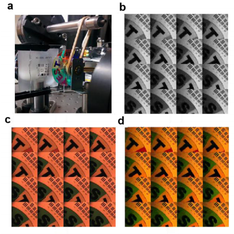 实验中重建视频空间大小为128 × 128,具有64个光谱频道,帧率约4帧/秒,压缩比约为900:1。图2展示从重建的高光谱帧中均匀选取16帧并转换为人工RGB图像,与彩色相机记录的画面对比,可见实现了高精度的重建。
