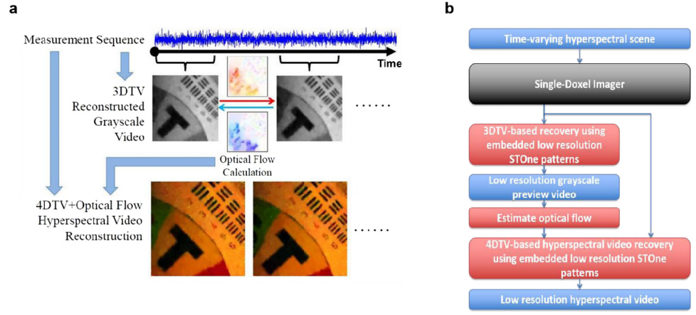 高光谱视频成像捕获场景的精细空间、光谱和时间信息,在生物荧光成像、遥感、监控、自动驾驶等领域中具有广泛应用。高光谱视频数据量极大,现有方法记录高维数据时占用大量传输带宽和存储空间,给无人机、手机、行星探测器和卫星等资源受限系统带来巨大压力。如何在保留信息的前提下最大限度减少采样数据量、大幅提升采样压缩比是高光谱视频成像中的关键问题。该研究利用四维高光谱视频的高度可压缩性,设计一种空间-光谱联合编码方案,提出基于四维空间信号稀疏度模型的优化重建和深度学习重建方法,实现了基于单像素探测器、可在低带宽下实现高通量的高光谱视频成像系统。如图1,优化重建方法先从包含互补图案的原始测量中重建灰度视频并提取光流,然后通过光流辅助四维全变分正则化优化方法实现高光谱视频重建。