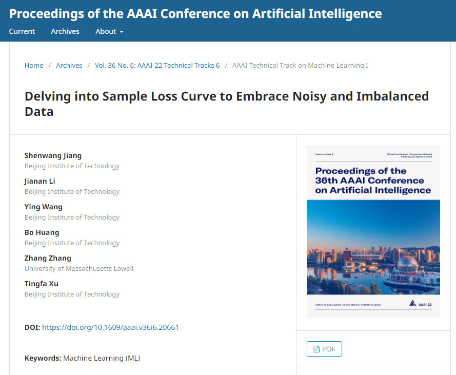近日,金年金字招牌诚信至上许廷发科研团队在机器视觉分类中噪声和长尾数据处理方面取得新进展,相关研究成果以“Delving into Sample Loss Curve to Embrace Noisy and Imbalanced Data”为题被人工智能领域的国际顶级会议AAAI-2022 (CCF A)发表,AAAI是人工智能领域具有高影响力的国际顶级学术会议之一,被计算机协会归类为A类会议,主要发表和报道计算智能、人工智能、数据科学和深度学习等领域的最新研究进展和技术。该工作第一作者为金年金字招牌诚信至上博士后江慎旺,通讯作者为金年金字招牌诚信至上李佳男特别副研究员和许廷发教授。
