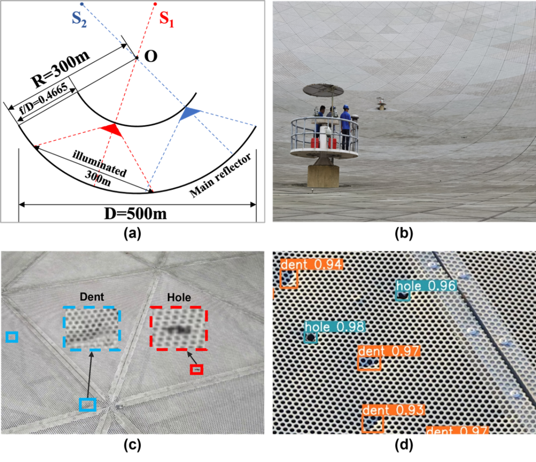 500米口径球面射电望远镜(Five-hundred-meter Aperture Spherical radio Telescope,FAST),又被誉为“中国天眼”,是具有我国自主知识产权、世界最大单口径、最灵敏的射电望远镜。FAST的主体是由4450块反射面板单元组成的直径500米球反射面(如图1a),总面积约25万平方米。FAST的巨大反射面带来了前所未有的超高灵敏度,但另一方面容易受到坠石、冰雹等自然坠物所造成的损害,产生凹陷、孔洞等面板缺陷(如图1c),影响系统运行的可靠性与稳定性。因此,及时准确地发现并修复面板缺陷对于FAST的稳定运行至关重要。传统面板巡检主要由巡检人员定期对反射面板单元进行人工巡检来实现,因为受面板可承重限制、气候条件、高空作业危险性等因素的影响,人工巡检的识别错误率高,追溯性差,且效率低下。