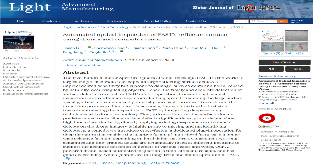 论文详情:Li J, Jiang S, Song L, et al. Automated optical inspection of FAST’s reflector surface using drones and computer vision[J]. Light: Advanced Manufacturing, 2023, 4(1): 1-11.