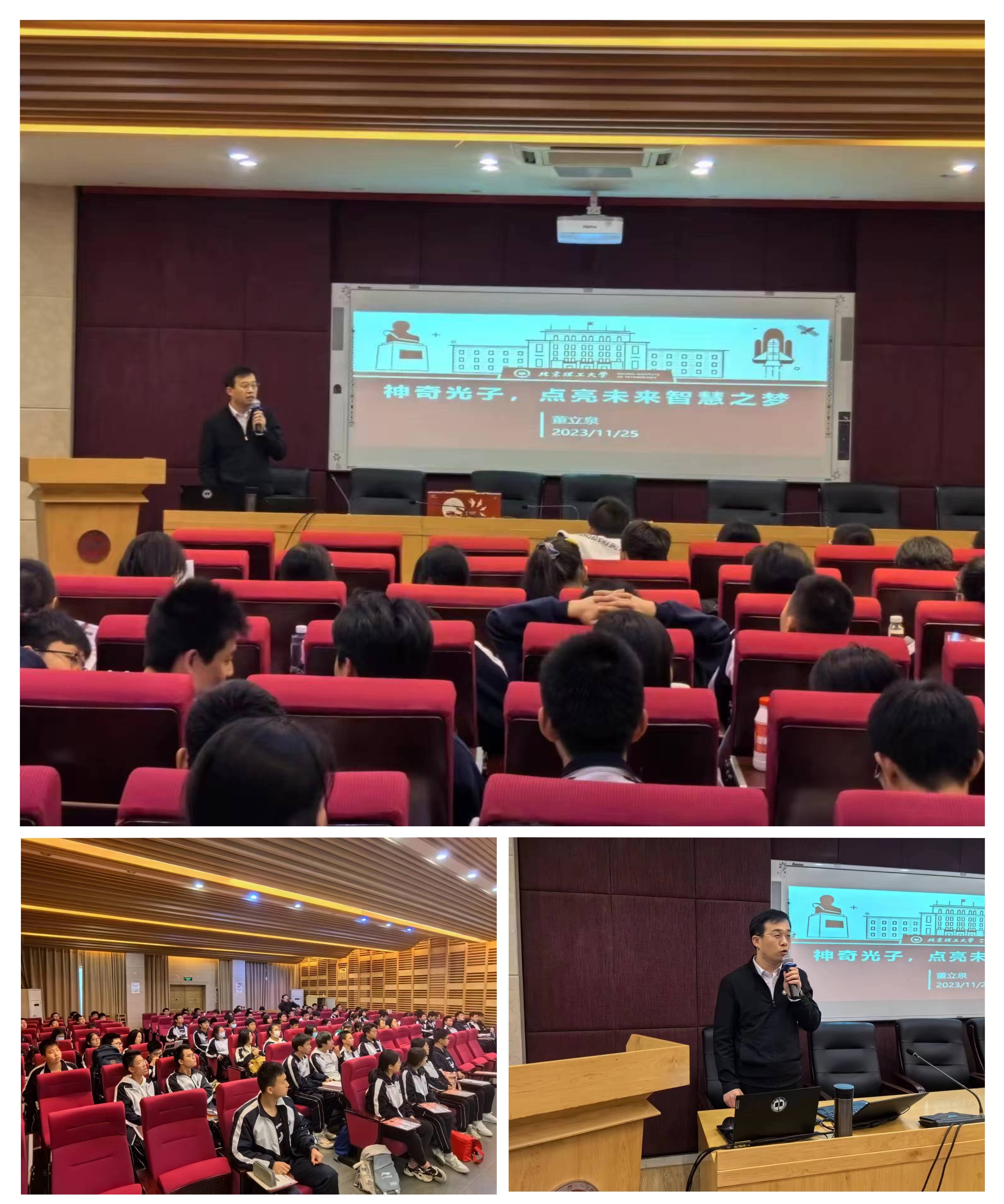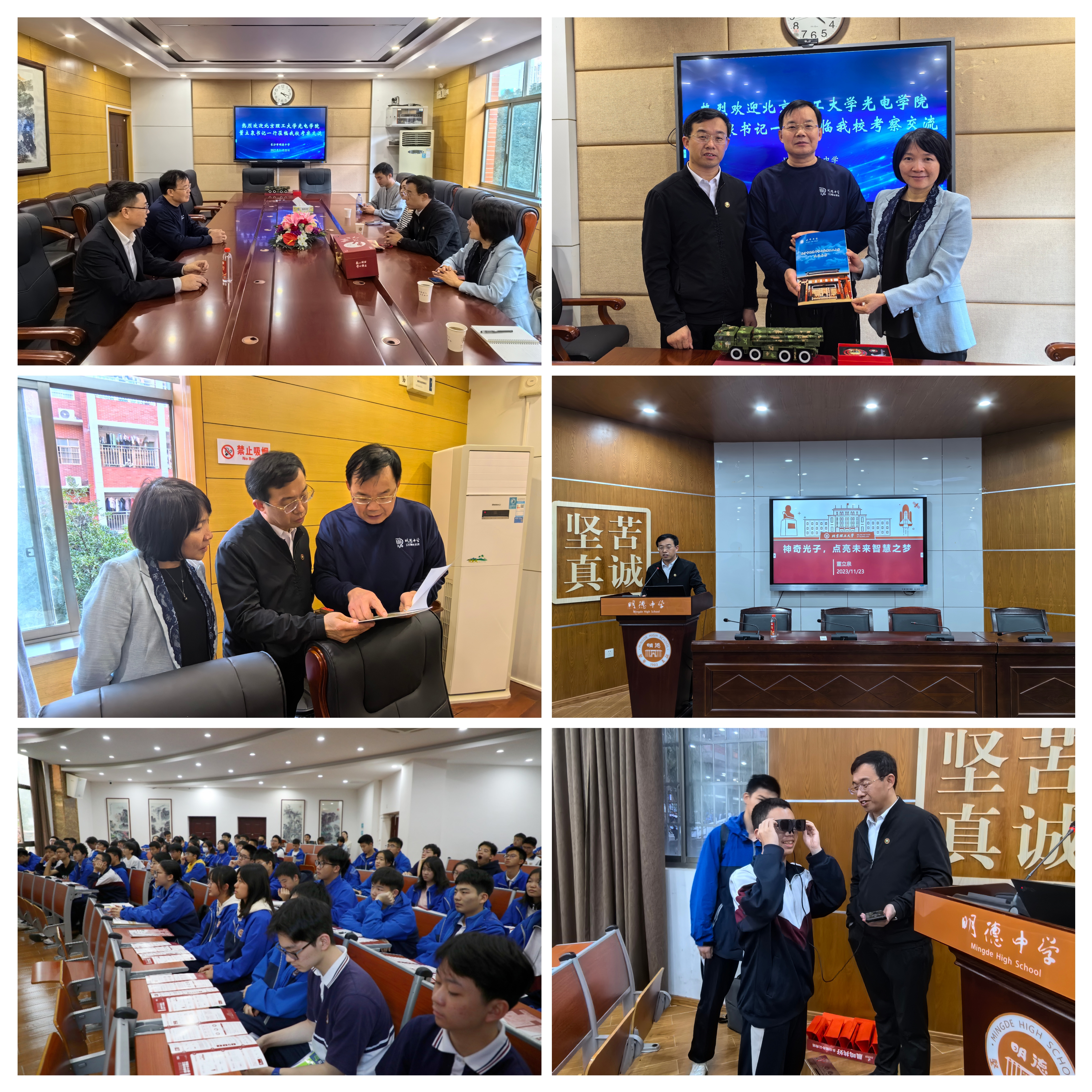 11月23日下午,董立泉、黄一帆带队招生组走访了明德中学并开展座谈交流,明德中学党委书记刘林祥、副校长匡拥军参加座谈,湖南招生组首先向明德中学一百二十周年校庆表达祝贺并赠送纪念品,明德中学回赠两校交流记录手册,以表两校友谊长存。随后董立泉面向高二师生做了以《神奇光子点亮未来智慧之梦》为主题的科普讲座,并播放北理工宣传片,吸引了众多对科技和工程领域怀有热情的学生踊跃交流,讲座现场招生组为学生发放北理工宣传折页,并鼓励优质生源报考我校。