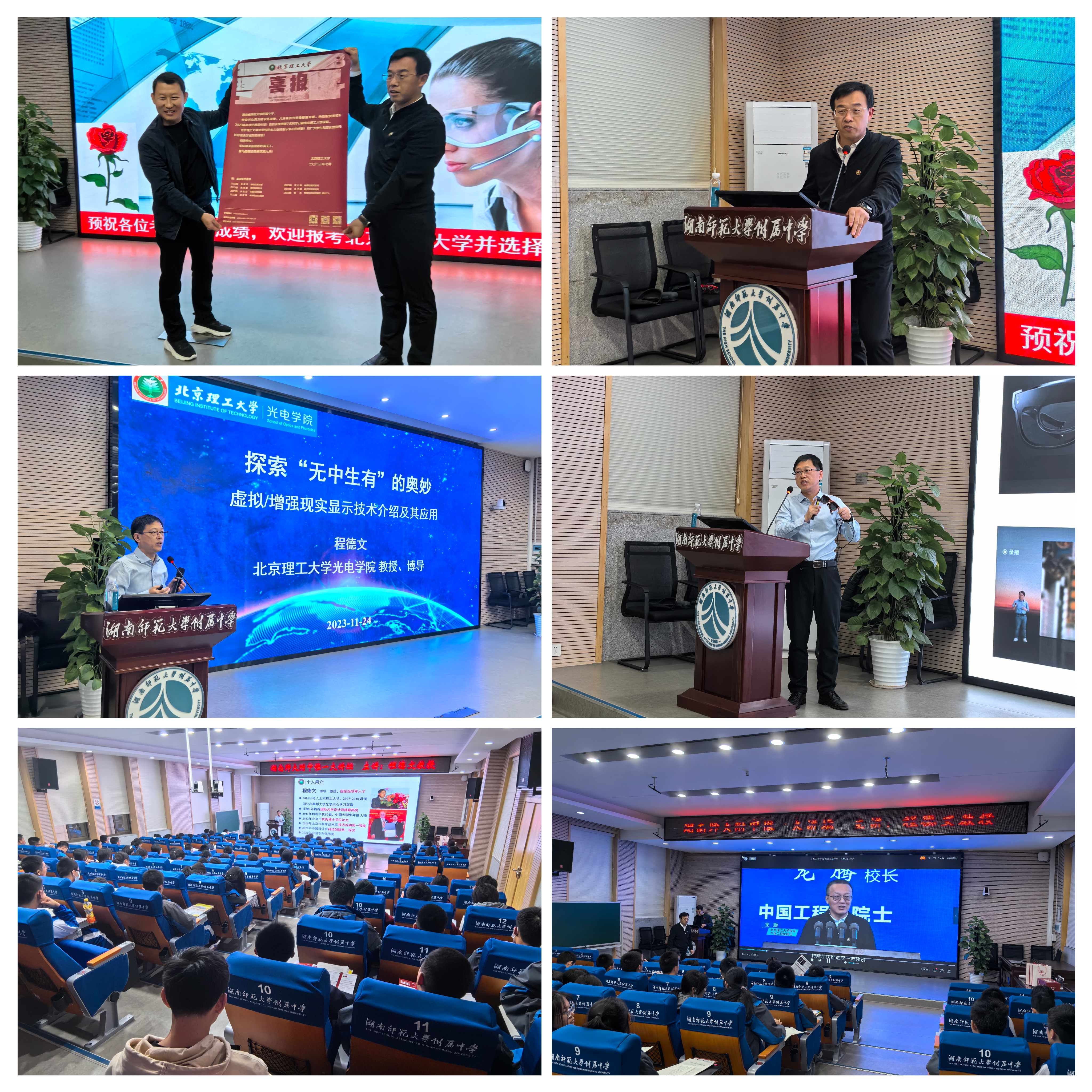 11月24日下午,董立泉带队招生组走访湖南师大附中并送喜报,与湖南师大附中校长谢永红、副校长苏建祥进行了交流。程德文教授面向高一学子做了以《探索无中生有的奥秘:虚拟现实与增强现实光学显示技术研究及应用》为主题的的科普讲座,并播放北理工宣传片,讲座现场招生组为学生发放北理工宣传折页,师生互动交流,反响热烈。