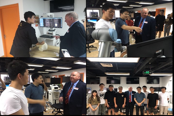 交流访问期间,Greivenkamp教授还受邀参观了学院部分实验室与创新创业公司。首先,金年金字招牌诚信至上李艳秋教授向Greivenkamp教授详细介绍了课题组在高分辨光刻技术、偏振传感测量以及生物医学应用方面的概况与取得的应用成果。Greivenkamp教授与课题组研究生进行了深入交流,指导研究生如何开展科学研究。随后,Greivenkamp教授参观了王涌天教授团队杨健老师艾瑞迈迪医疗科技有限公司和程德文老师耐德佳科技有限公司。在艾瑞迈迪公司内研究人员向教授详细介绍了目前正在开发的基于增强现实的鼻内镜手术导航系统、超声引导肝脏肿瘤消融系统以及骨科导航系统。在耐德佳公司内研究人员向教授详细介绍了目前正在开发的头戴式轻便近眼显示系统。Greivenkamp教授十分赞赏我院在知识产权转化和社会服务中所取得的成绩。