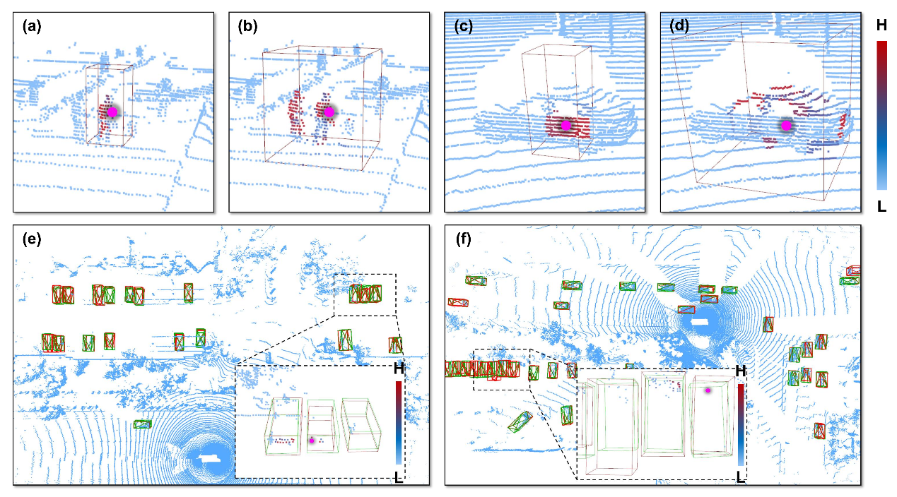 该方法基于混合尺度注意力机制的强大多尺度特征捕获能力(见图2(a)-(d)),在大规模Waymo数据集上的检测精度超过了同期性能最优的双阶段检测器。图2(e)-(f)展示了部分在Waymo数据集上的部分检测结果,该方法可以精确检测仅具有极度稀疏点云表示的远距离车辆目标,并在处理带有巨大尺度变化的密集行人时也表现出优异的性能。