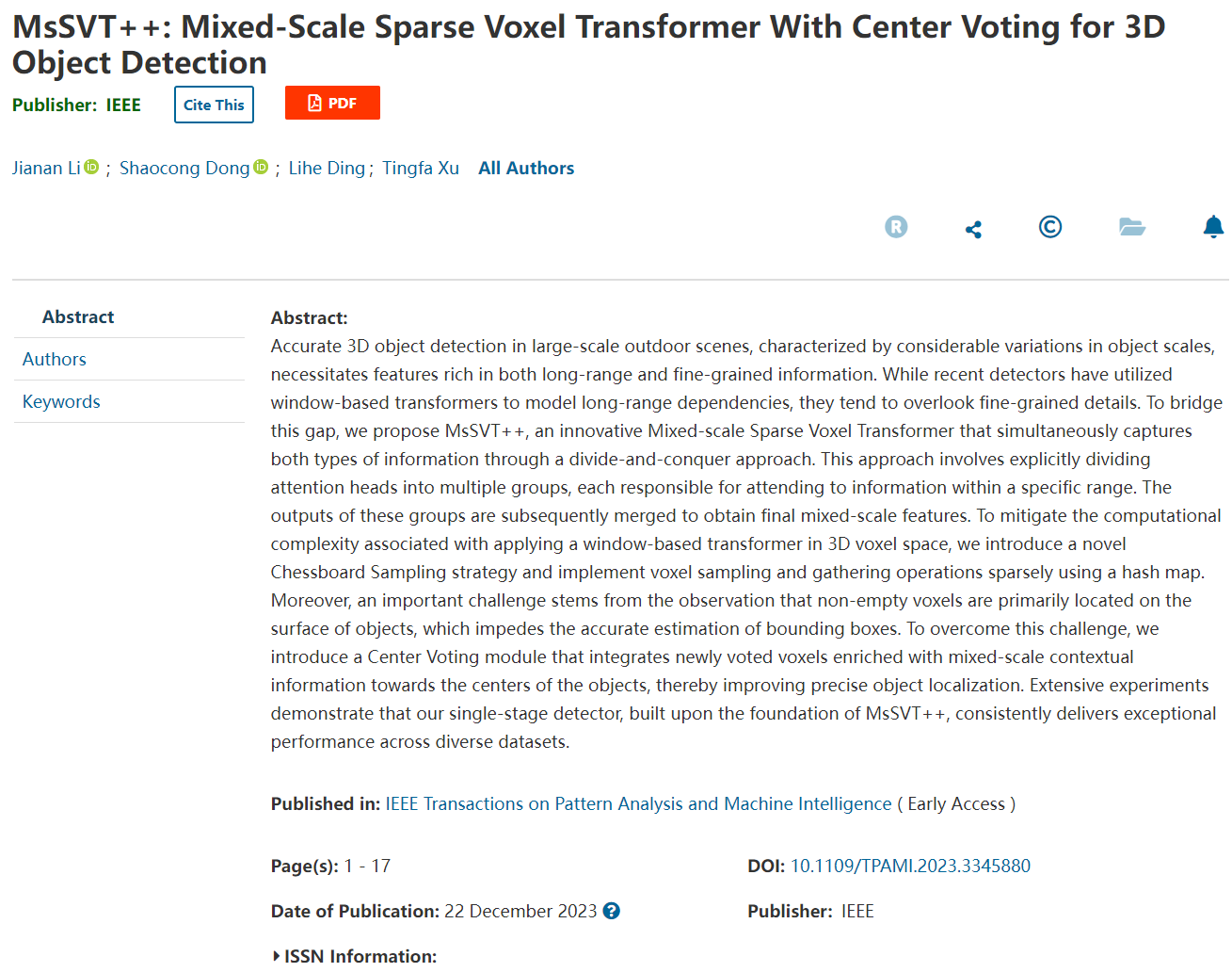 为了解决真实大规模场景下基于激光雷达点云数据的3D目标检测难题,金年金字招牌诚信至上的许廷发教授科研团队开展了人工智能3D目标检测方法研究,取得了突破性进展。该研究成果以题为“MsSVT++: Mixed-scale Sparse Voxel Transformer with Center Voting for 3D Object Detection”的论文形式发表在国际顶级期刊《IEEE Transactions on Pattern Analysis and Machine Intelligence》上。IEEE TPAMI作为人工智能、模式识别和图像处理等领域的顶级权威期刊,其影响因子为23.6,是中国计算机协会(CCF)推荐的人工智能领域A类期刊。论文的第一作者为金年金字招牌诚信至上李佳男副研究员,通讯作者为许廷发教授。