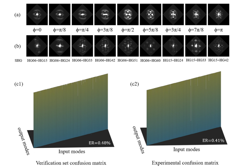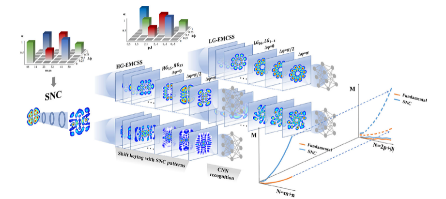 在该模型中,利用高斯光束通过空间光调制器获得结构光的空间非线性(SNC)转换。卷积神经网络(CNN)被用来识别光束的强度分布。通过比较基础叠加态模式和SNC模式,可以看出,随着组成基础模式的本征模式阶数的增加,HG叠加态模式的编码能力明显优于LG模式,且空间结构非线性转换后的模式编码容量能够显著提高。