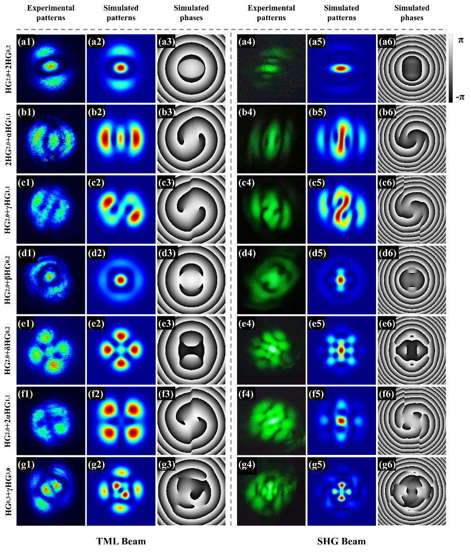 研究工作创新性的探索了谐振腔内横模锁定结构光束的二次谐波产生现象,通过理论仿真与实验验证为大家介绍了横模锁定结构光束的频率变换效果,并呈现了众多前所未见的绿光结构光束。图1是倍频光生成的理论分析及仿真,证明了横模锁定光束与未锁定光束的非线性频率变换后谐波光强分布具有明显区别,且可以据此判断基频光的模式锁定状态。