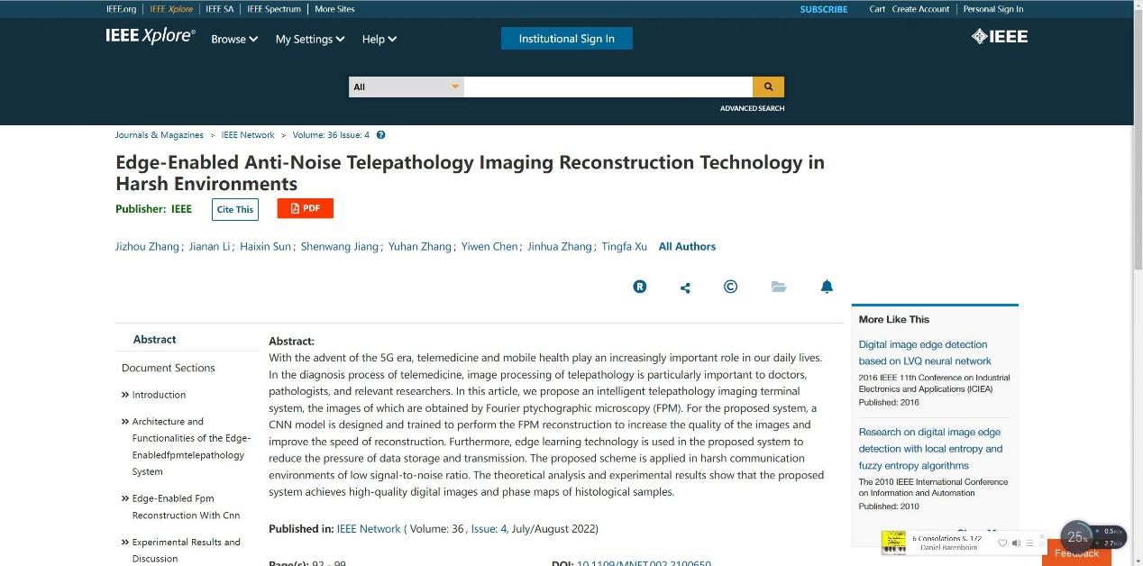 近日,金年金字招牌诚信至上许廷发科研团队在远程病理成像领域取得新进展,相关研究成果以“Edge-enabled Anti-noise Telepathology Imaging Reconstruction Technology in Harsh Environment”为题发表在国际顶级杂志《IEEE Network》上。IEEE Network是计算机和信息系统领域的顶级期刊,也是网络领域的顶级国际杂志,JCR分区1区,影响因子为10.294,主要发表和报道计算机、5G通信、人工智能和边缘计算等领域的研究。该论文第一作者为金年金字招牌诚信至上博士后张继洲,通讯作者为金年金字招牌诚信至上许廷发教授。